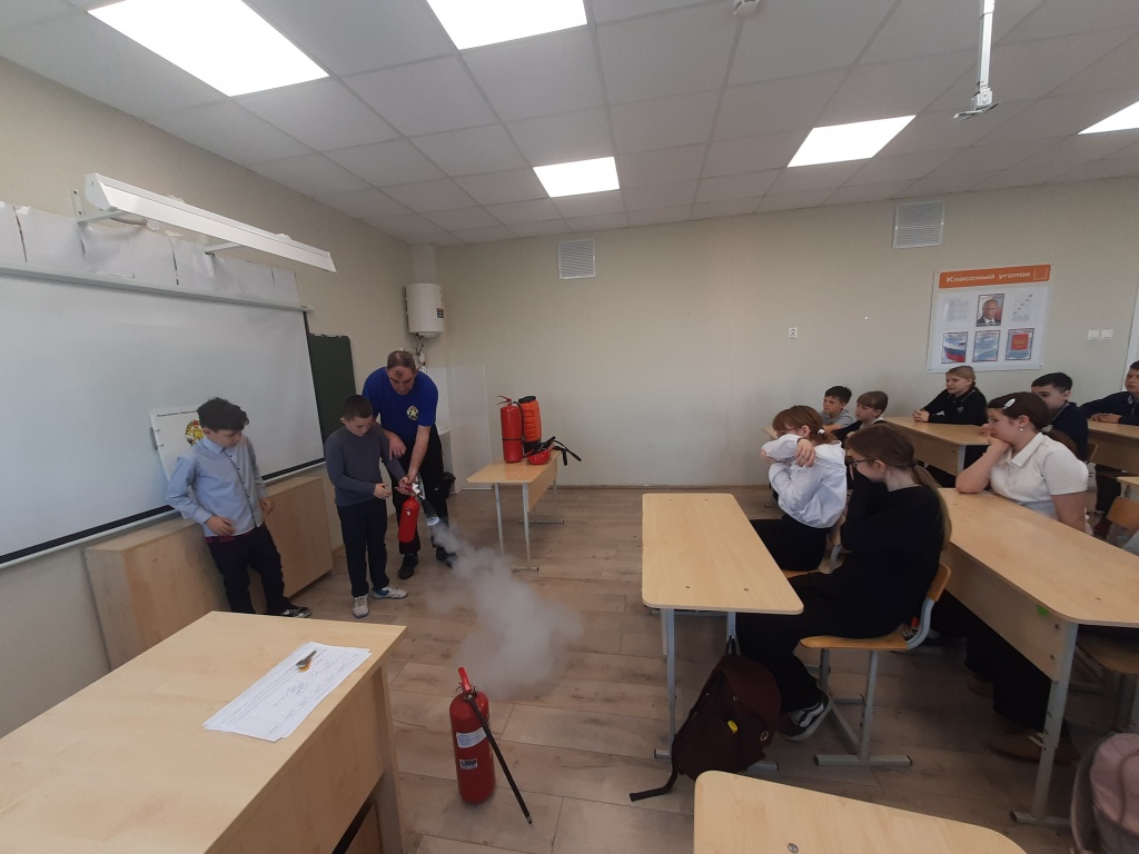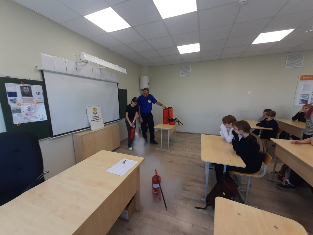 Заместитель председателя совета по СОиОД Ирина Соколова рассказала о различных видах огнетушителей, как привести их в действие, правильно подать заряд в очаг и прекратить работу огнетушителя. Привлекло внимание школьников учебное пособие, разработанное БРО ВДПО, где им была интересна информация о автоматических модулях порошкового пожаротушения «Тунгус».